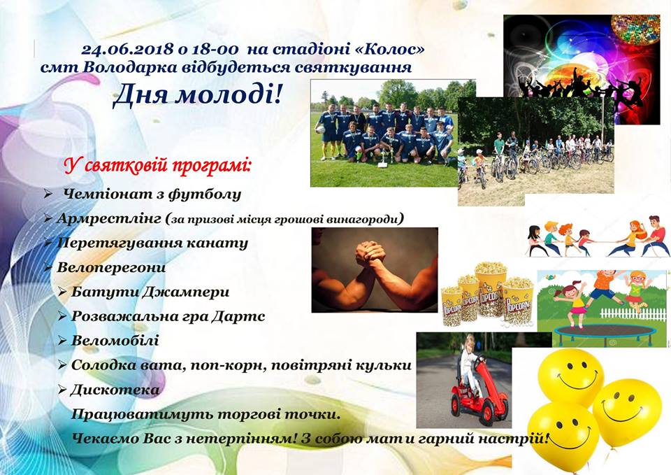 24 червня на стадіоні «Колос» смт Володарка, що у Київській області відбудуться різноманітні спортивно-розважальні заходи в рамках святкування Дня молоді.