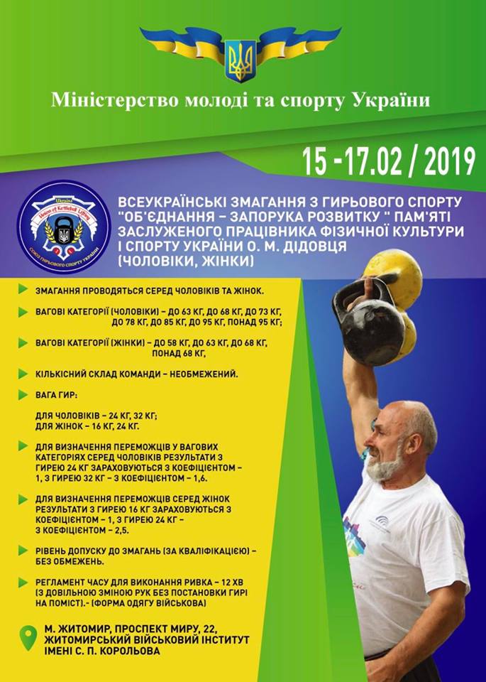 З 16 по 17 лютого у Житомирі відбудуться Всеукраїнські змагання з гирьового спорту пам’яті Олександра Дідовця - нашого всіма шанованого гирьового друга та видатного спортсмена.