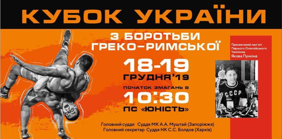 У Палаці спорту «Юність» (Запоріжжя) 18-19 грудня відбудеться Кубок України з греко-римської боротьби серед дорослих, присвячений пам'яті першого Олімпійського чемпіона Якова Пункіна.