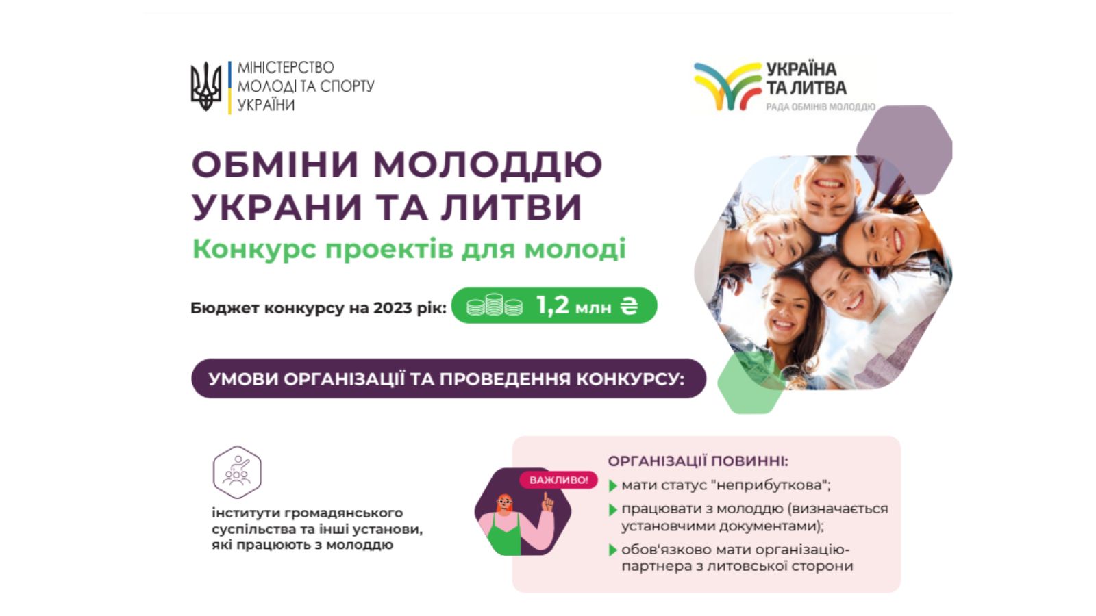 20 березня 2023 року Мінмолодьспортом оголошено прийом заявок на участь у конкурсі на реалізацію проектів у рамках здійснення обмінів молоддю України та Литви у 2023 році, що триватиме до 20 квітня 2023 року.