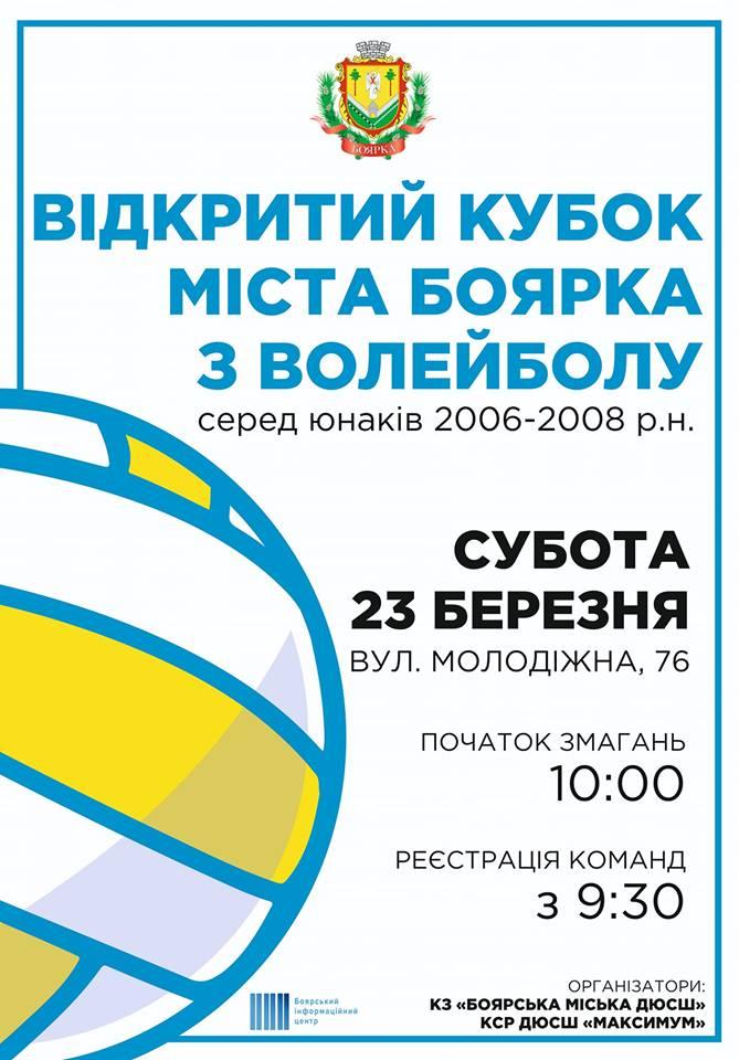 Відкритий Кубок міста Боярка з волейболу серед юнаків 2006-2008 років народження цієї суботи, 23 березня відбудеться у Боярці.